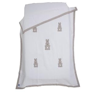 Product Description : 9610897U Features: -Material: 100pct Cotton.-Lined with a soft cotton jersey.-Perfect all-purpose blanket.-Perfect balance between cuddly cute and polished chic.-Designed specifically for babies.-Bedding and accessories are as soft as a baby's delicate skin. Options: -Also available in Bassinet/stroller size. Color/Finish: -Five cute bunnies feature across the blanket in a delicate mocha color. Collection: -Misha Bear Collection.