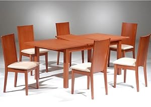 Product Description : Invite your family and friends over to dine at this plush dining table set. With its tall, sleek chair backs, and extending rectangular table top, this dining set will complement any style in your house. The cherry colored table and chairs are made from beech wood veneer and solid woods. The chair cushions are made out of beige micro fiber. Wood. Table Closed: 30" H X 35" W X 60"L Table Open: 30" H X 35" W X 77.32"L Chair: from floor to seat=19.68", from floor to top of chair=37.8" Assembly level/degree of difficulty: Easy.