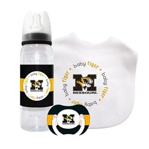 Vendor: Includes Bib, Pacifier and 9 oz. Bottle All three items in the set prominently display the Missouri Tigers team logo and colors
