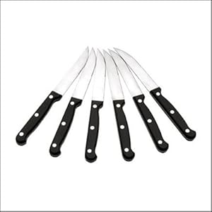 Product Description : MIU France 6-Piece gourmet steak knife set, item # 90012. Sharp serrated stainless steel blade with a polyoxymethylene handle. Perfect for home or restaurant use since they are dishwasher safe. Effortlessly cuts thick pieces of steak. Also can be used to cut bread. Does not need sharpening as often as a straight blade. Riveted handle. Blister packed in a set of 6 for safe shipping. Each knife measures: 8.5" L x 0.75" W x 0.5" H