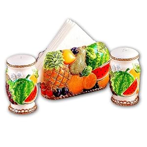 Product Description : Take a look at this BRAND NEW Mixed Fruit 3-Dimensional Table Set. Included in the set are Salt & Pepper Shakers, and a Napkin Holder. This beautiful Table Set matches one of our Mixed Fruit design lines. The set is really beautiful with plenty of detail, vibrant colors, and gorgeous design! The Napkin Holder is approx 4.5" tall and measures approx. 4" wide. The shakers measure approx. 3" tall . Each piece is made of a high quality ceramic with a very fine gloss finish coating it. There are plastic seals / plugs on the bottom of each shaker that holds in it's contents and allows for easy refilling. Please take a look at the pictures. The best explanation will be in the images. This would make a wonderful addition to any collection, or this would make a great gift for any collector. Don't forget to take a look at our other items of this same design set and other styles. Thanks for looking! =)