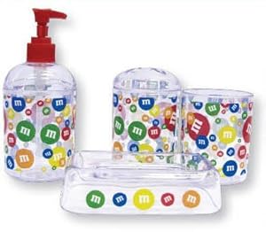 Product Description : From the M&M's Bath Collection. M&Ms Candy Bath Accessories Set. This bath accessories set includes a liquid soap dispenser, a toothbrush holder, water cup, and a soap dish. Each piece is clear and has an M&M pattern. Officially licensed product.