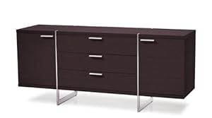 Product Description : Featuring two doors and three drawers, the Greenwich sideboard is finished in luxurious wenge veneers with the direction of the grain articulating the different sections. This dining buffet with its striking appearance, seeming to be suspended from the stainless steel legs which run from top to floor, will be a great addition to a modern living room. Features: Wenge finish Two doors Three drawers Stainless steel legs Solid hardwood construction No assembly required Specifications: Dimensions: 27" H x 63" W x 18" D Weight: 176 lbs