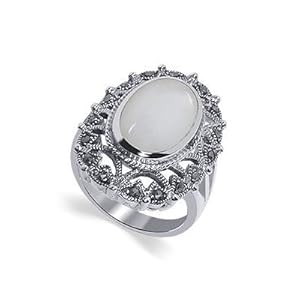 Nickel Free Sterling Silver Oval Shaped 14mm x 17mm Mother of Pearl Polished Finish 3mm Marcasite Band Ring Size 5 , 6...
